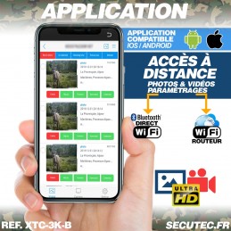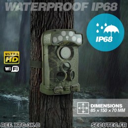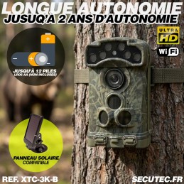 Caméra de chasse et de surveillance extérieure haute performance avec photos jusqu’à 32 MP, vidéos 3K UHD avec audio, vision nocturne infrarouge invisible 950 nm (portée 20 m) et connexion Wi-Fi & Bluetooth. Enregistrement sur carte mémoire SD / SDHC jusqu’à 256 Go, déclenchement ultra-rapide 0,6 s, autonomie longue durée et boîtier étanche IP68, boitier anti vandal .