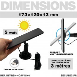 | Dimensions | 270 x 260 x 55mm (panneau solaire), 3 mètres de câble, 160×50×50 mm (routeur hors antenne), 100×80×54mm (camera), 173×120×13 mm ( panneau solaire caméra ) 300 cm (longueur câble) |