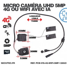 Micro caméra 4G ou Wi-Fi ultra HD 5 Mpx à intégrer, objectif type vis, enregistrement audio vidéo à la détection de mouvement, détection humaine, détection audio, et en continu sur carte micro SDHC jusqu'à 128Go incluse, accès a distance depuis un smartphone / Tablette (iPhone) iOS / Android et logiciel PC, alerte par notification push sur appareil mobile, écoute à distance, envoi d'email et upload sur FTP en cas d'alerte, alimentation DC 12V 2A