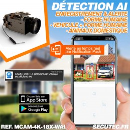Enregistrement sur détection AI (humain, véhicule, animal) avec encadrement intelligent de la cible.