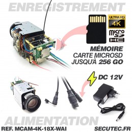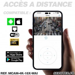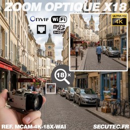 Mini caméra de vidéosurveillance 4K UHD (8 Mpx) avec zoom optique x18 (5,4–96,3 mm), connexion IP Wi-Fi via routeur et appairage P2P simplifié. Accès et contrôle à distance depuis smartphone et tablette iOS / Android ainsi que logiciel PC, avec écoute audio intégrée grâce au microphone. Enregistrement vidéo 4K continu, programmé, en timelapse ou déclenché par détection de mouvement intelligente “humaine”. Stockage sur carte micro-SDHC jusqu’à 256 Go incluse ou sur serveur FTP. Alertes instantanées par notifications push en cas de mouvement. Alimentation 12V.