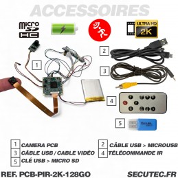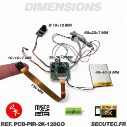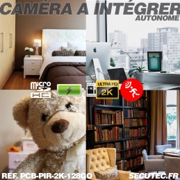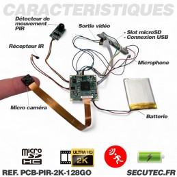 Module caméra cachée 2K, Caméra espion DIY pour intégration discrète, offrant un enregistrement vidéo Ultra HD 2K (2304×1296 à 30 images/seconde) sur carte micro SDHC jusqu’à 128 Go (carte 128 Go fournie). Détection de mouvement par capteur PIR avec enregistrement automatique, modes continu ou programmé. Sortie vidéo analogique pour visualisation et paramétrage sur moniteur via télécommande sans-fil. Batterie rechargeable longue autonomie : jusqu’à 2 mois en veille et 4 heures en enregistrement continu.