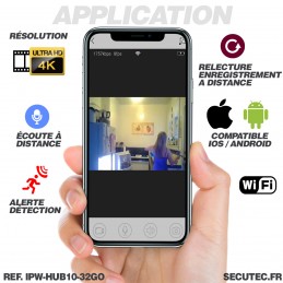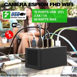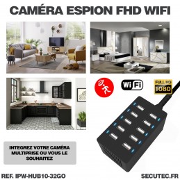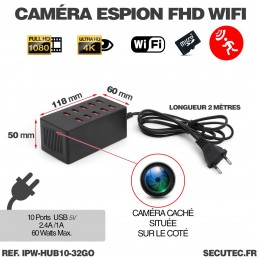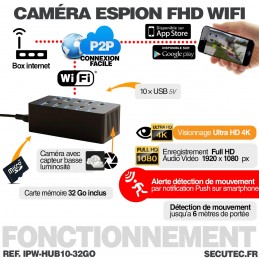 Caméra cachée WiFi IP dissimulée dans un hub multiprise USB fonctionnel (jusqu’à 10 ports actifs). Offrant une image UHD 4K en direct et un enregistrement vidéo Full HD 1080P, cette caméra espion intègre un capteur 2 Mégapixels grand angle 90° avec détection de mouvement et vision en basse luminosité. Elle enregistre sur carte microSDHC jusqu’à 128Go (carte 32Go incluse) et se contrôle facilement à distance depuis une application iOS ou Android. Idéale pour une surveillance discrète à domicile ou au bureau.