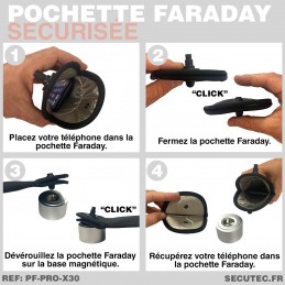 Pack de 30 Pochettes Faraday en néoprène (25 x 12 cm) pour smartphone, bloque les ondes et sécurise l’appareil grâce à sa fermeture magnétique anti-vol. Idéale pour écoles et établissements scolaires, avec base de démagnétisation