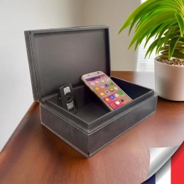 La boîte Faraday de couleur noire bloque efficacement tous les signaux sans fil (RFID, Wi-Fi, GPS, Bluetooth, etc.) pour protéger vos appareils contre le piratage, le suivi et l'espionnage. Avec son blindage en titane RF double couche et son extérieur en cuir élégant, elle neutralise les signaux de clés de voiture, smartphones et cartes sans contact....